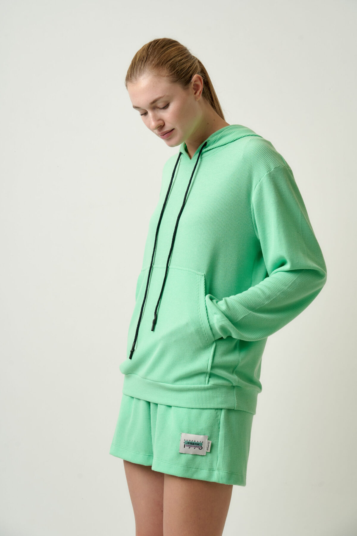 Buzo estilo canguro con capucha ajustable y detalle de etiquetas en espalda. Textil con caída de tacto soft y textura diferenciada. Diseño liviano para brindar mayor libertad de movimiento en el día a día.