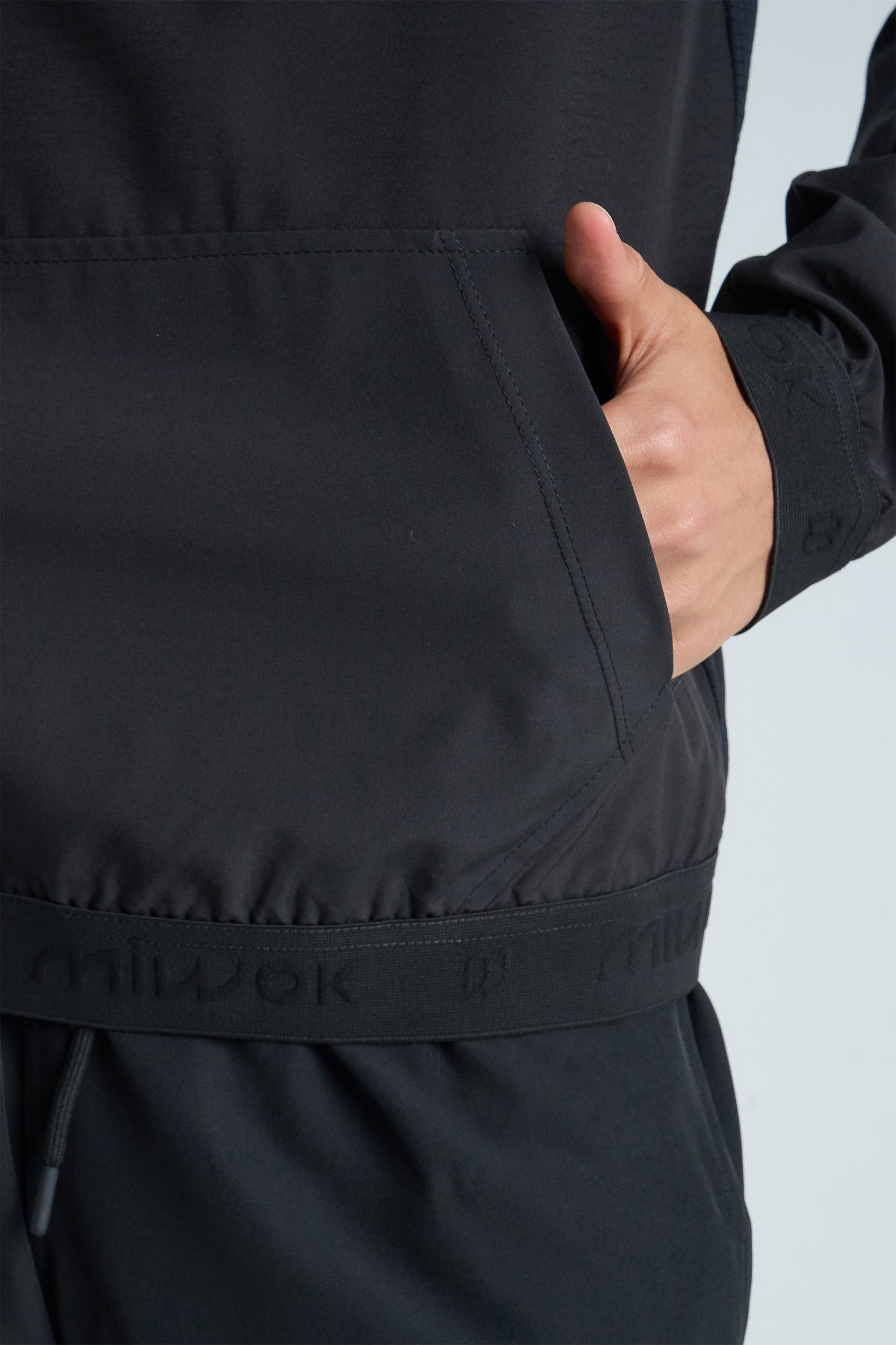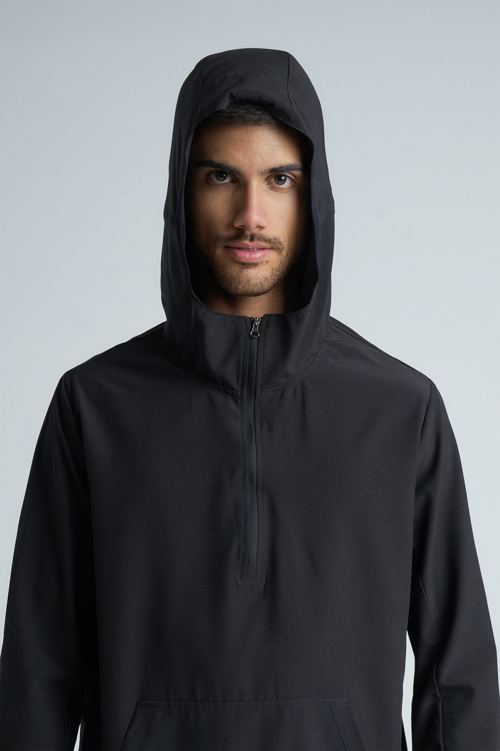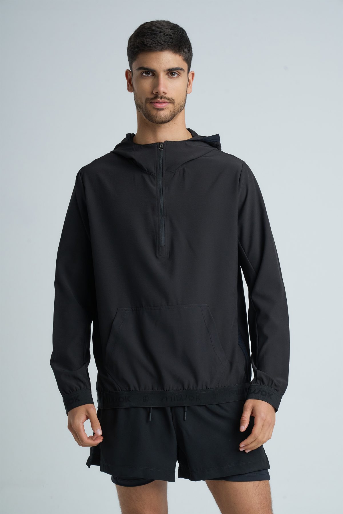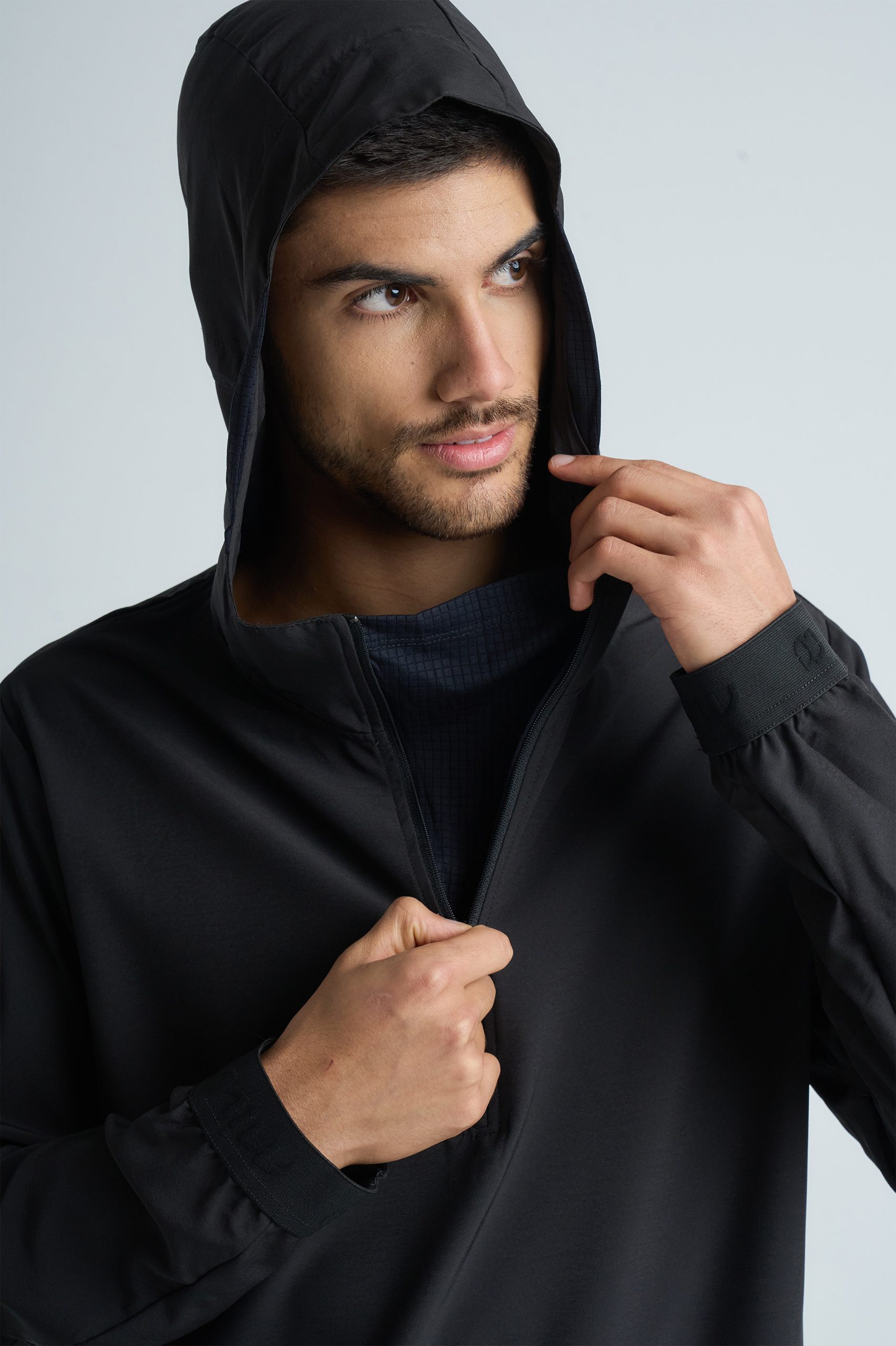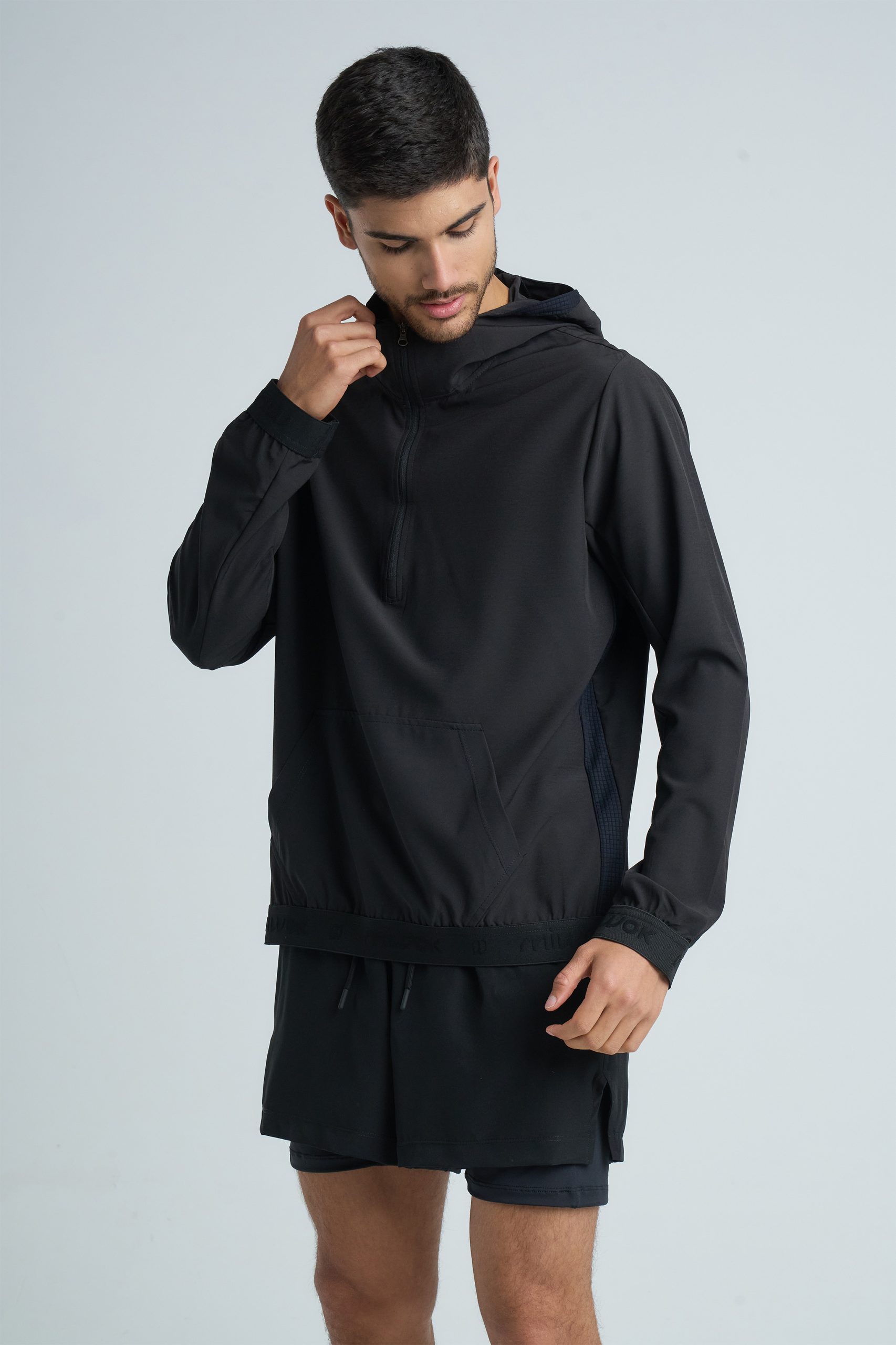 Buzo de running confeccionado en textil Microfibra plana elastizada liviana, combinada con textura minicuadraditos. Diseño funcional: Presenta un sistema de vista interna en en medio cierre frontal, ajuste en la capucha y bolsillo canguro para optimizar su rendimiento en el uso diario.