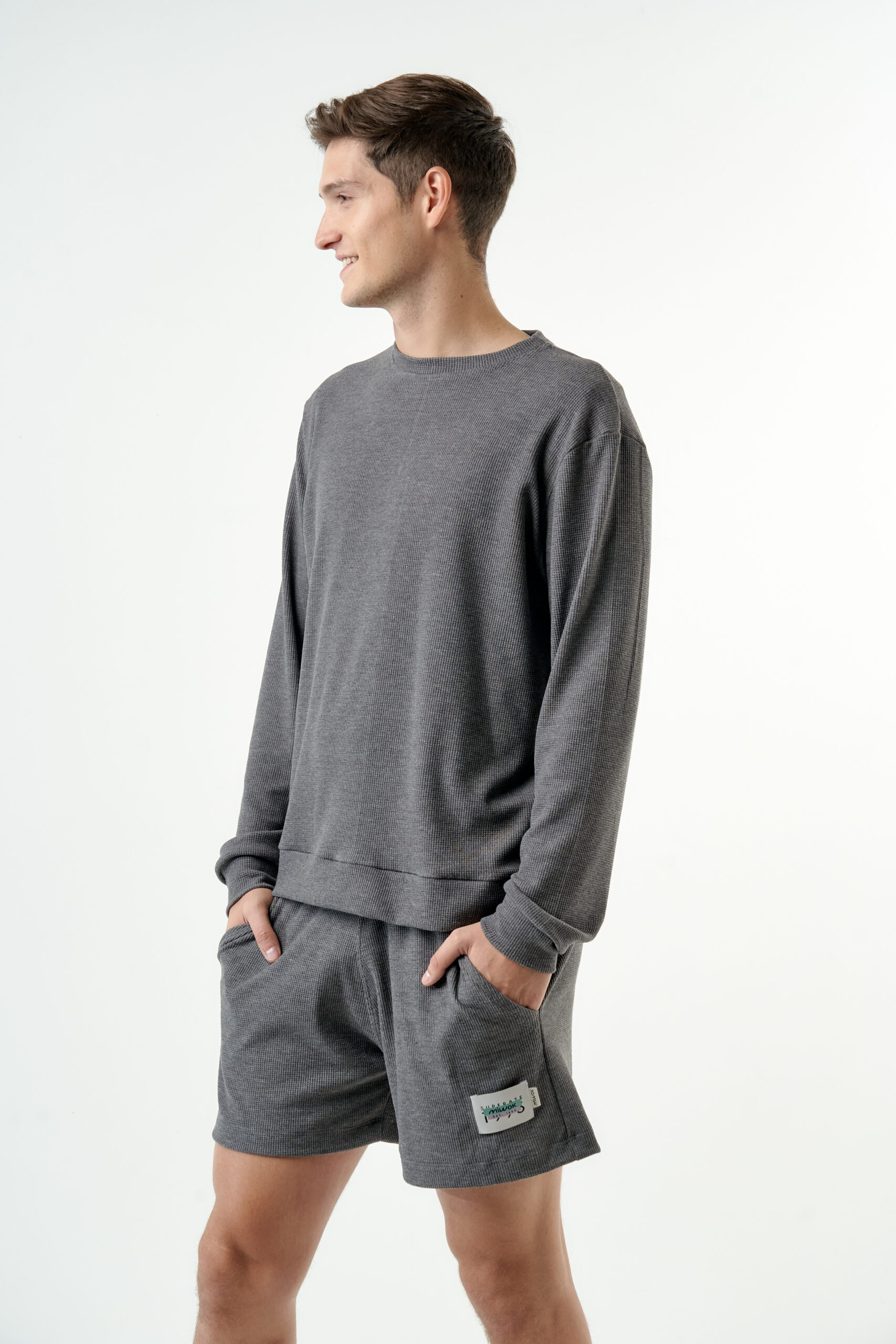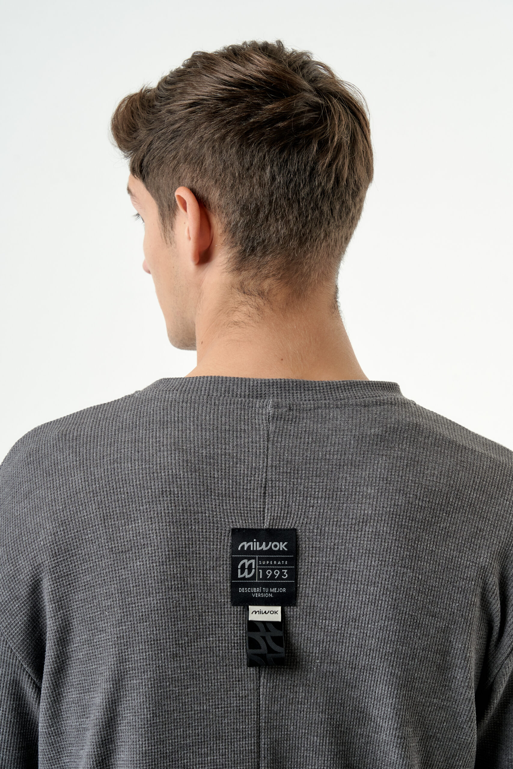 Buzo clásico escote redondo con detalle de etiquetas en espalda. Textil con caída de tacto soft y textura diferenciada. Diseño liviano para brindar mayor libertad de movimiento en el día a día.
