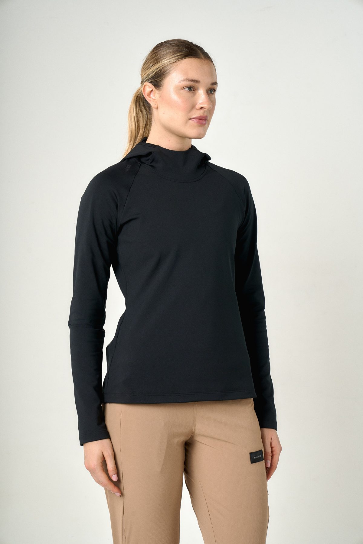 Buzo térmico en microfibra frisada y elástica; con capucha y manga larga. Cuenta con una abertura en el centro de capucha que funciona como pasador para el pelo, bolsillo con cierre invisible trasero para asegurar su funcionalidad en los días más fríos.