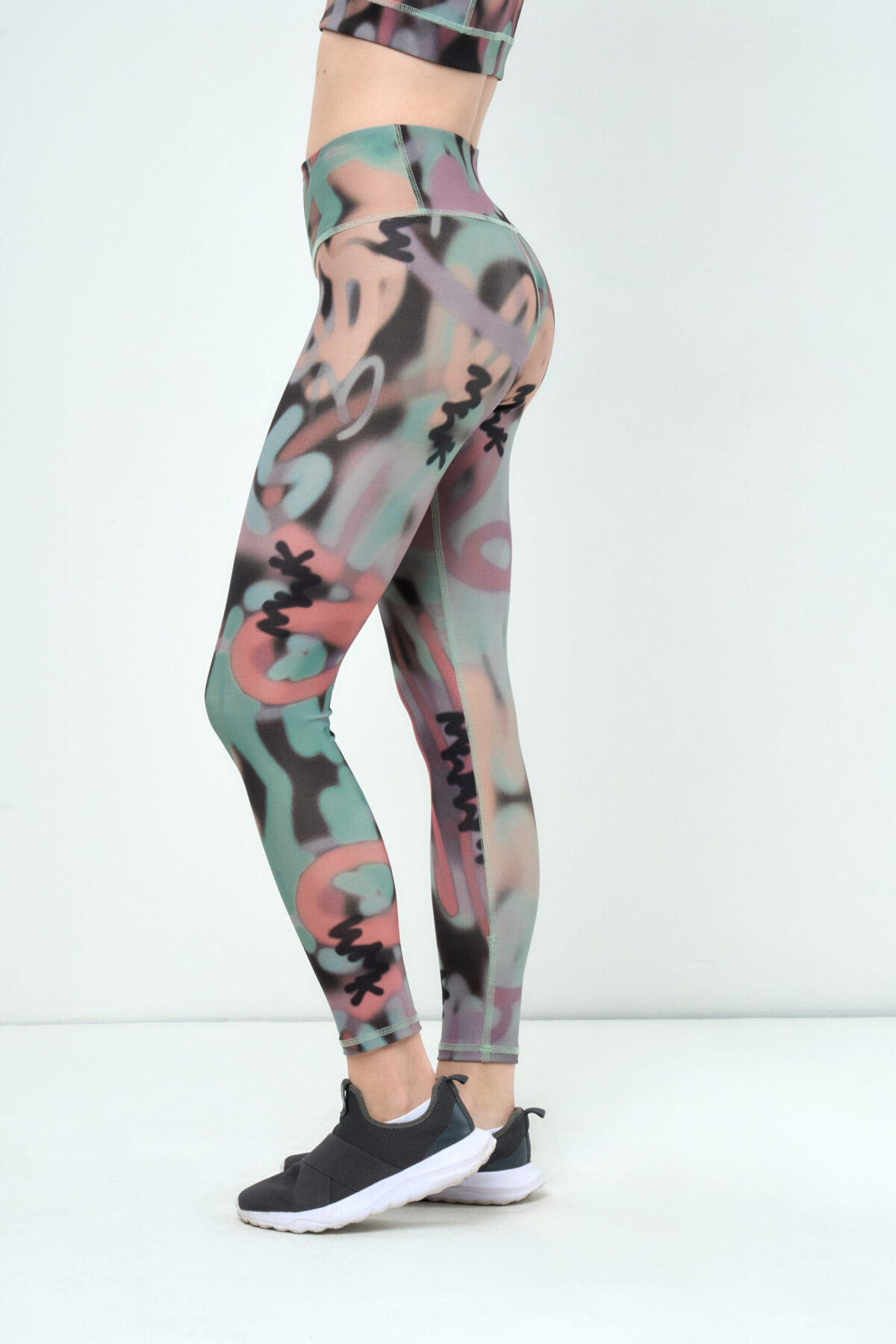 Calza reversible estampada, confeccionada con tejido ecológico teñido sin consumo de agua. De cintura alta y doble, tejido ligero y elástico, efecto segunda piel. Estiliza la figura,