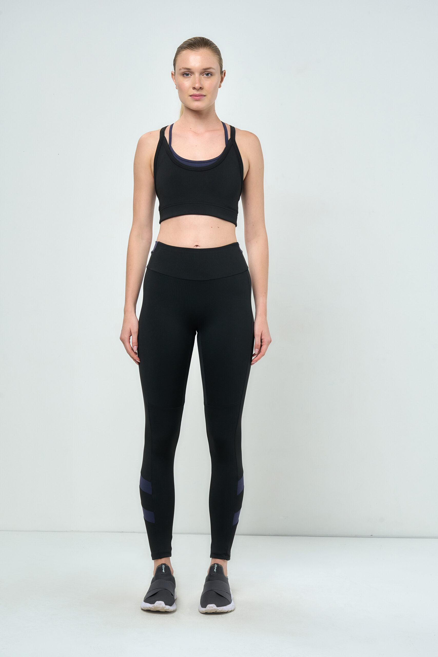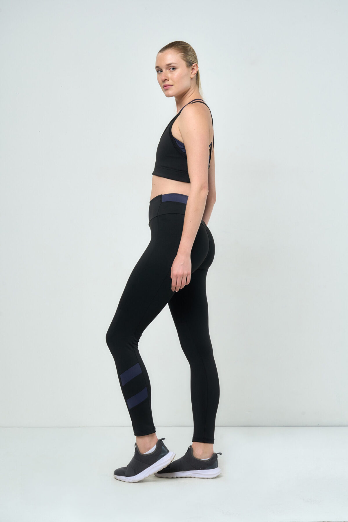 Calza deportiva combinada sin tiro delantero, confeccionada con tejido hecho 100% a partir de botellas plásticas recicladas. Su construcción sin tiro logra no marcar manteniendo un