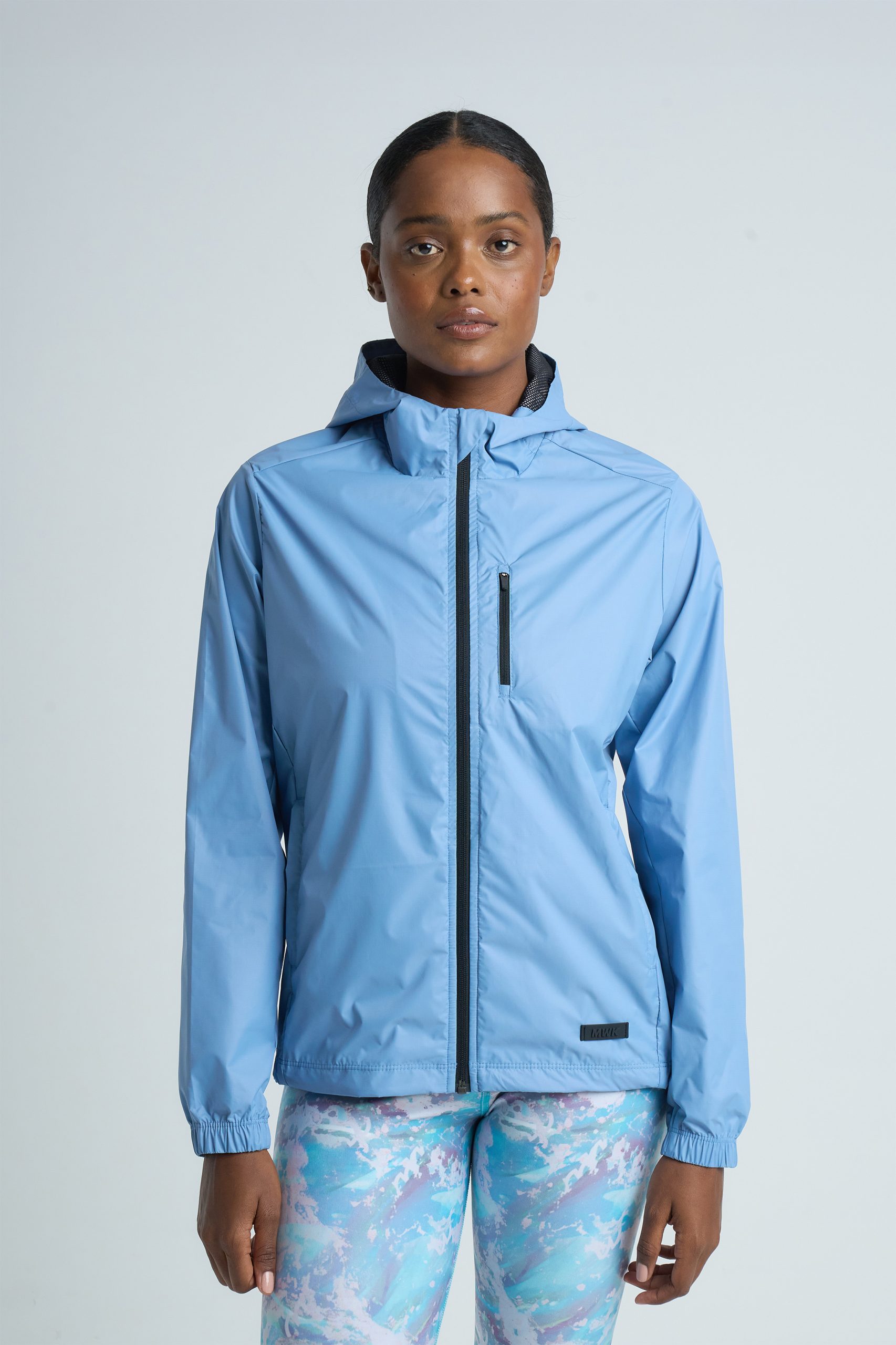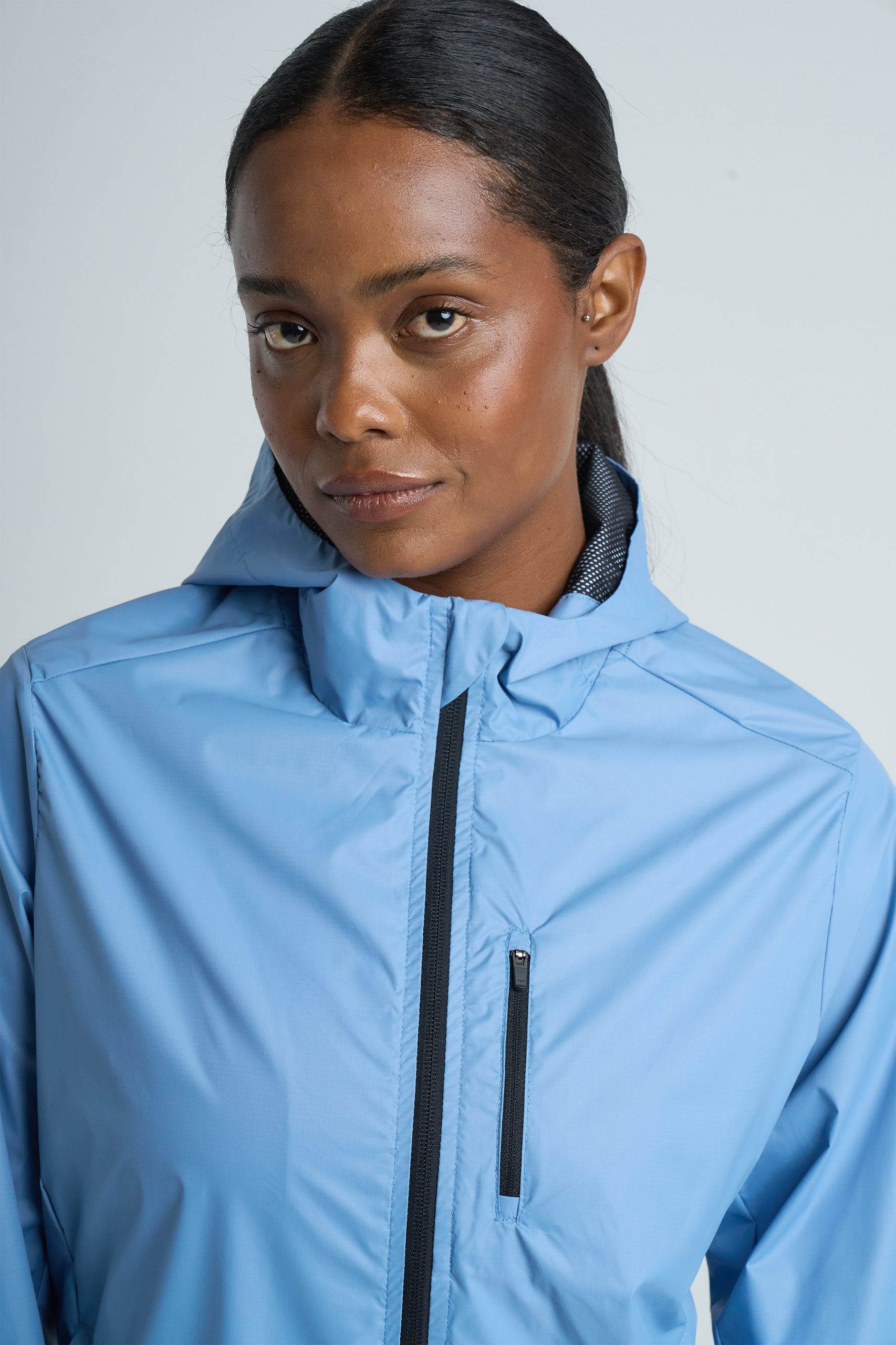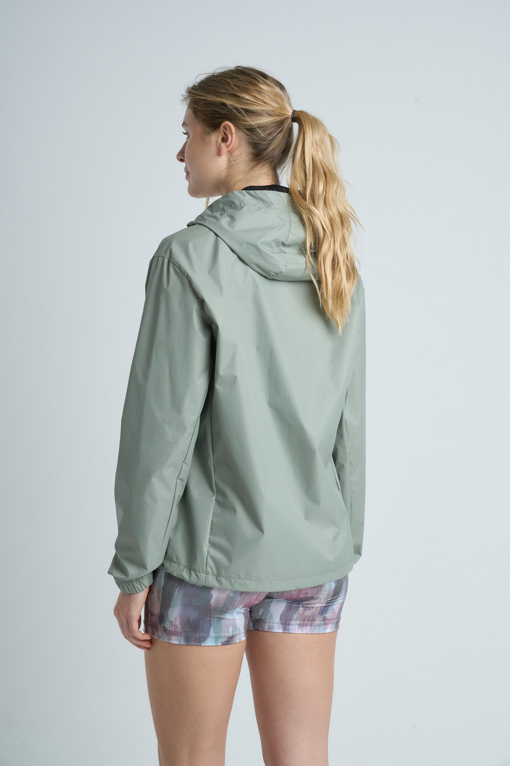 Campera de running rompeviento, confeccionada en textil semi mate con recubrimiento interno impermeable, soporta 2000mm de columna de agua. Con diseño optimizado para ser altamente funcional, posee vista interna en cierre, cintura ajustable para proteger e impedir el paso del agua, amplios bolsillos laterales y superior con cierre, capucha y ajuste de elástico en puños. Posee bolsa interna para autoguardado. Textil no transpirable.