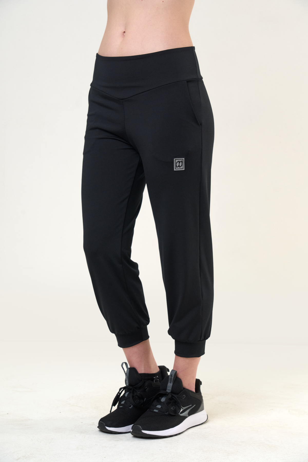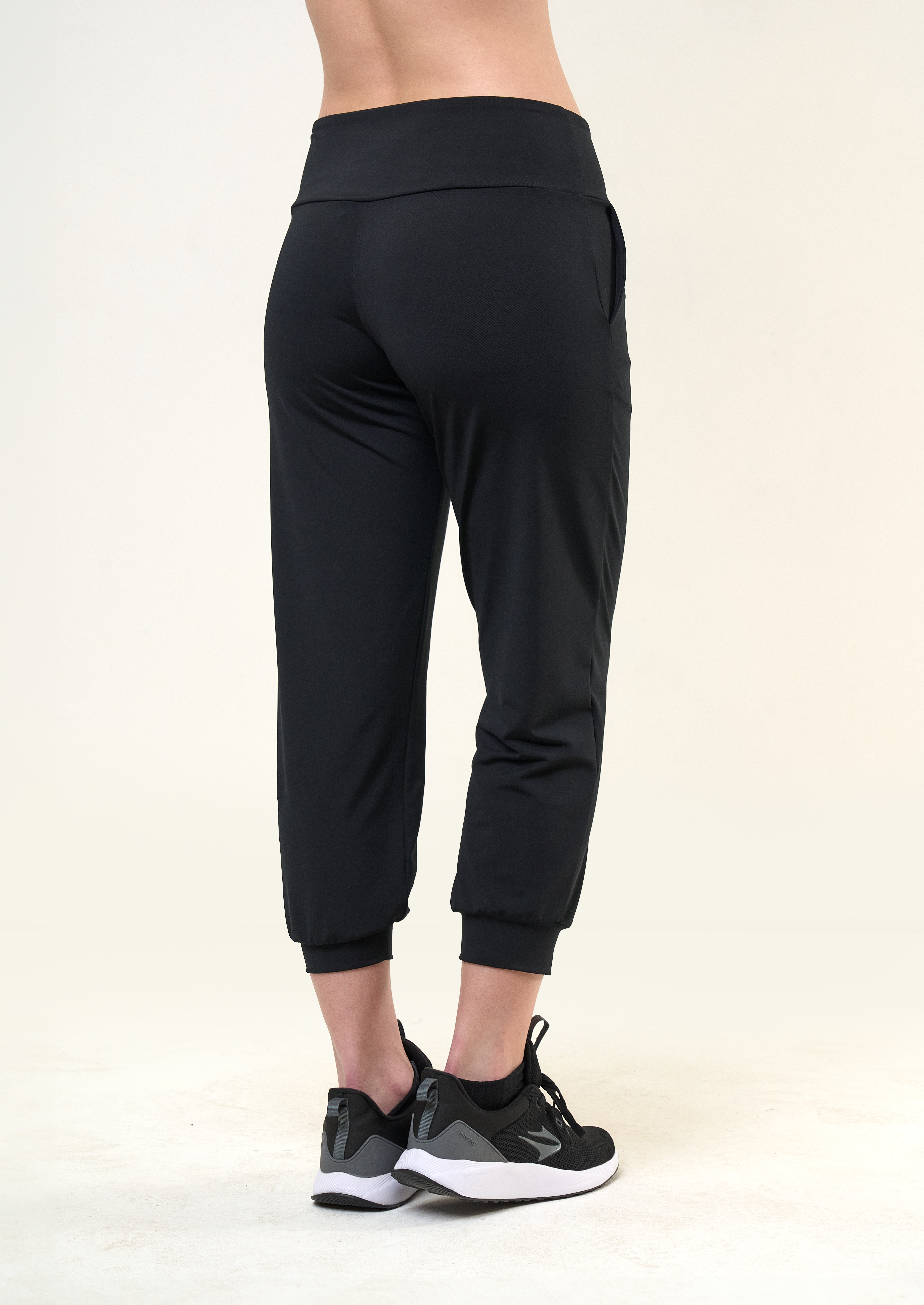 Capri con puño y cintura adaptable a tu cuerpo hecho con textil microfibra liviana, ideal para el deporte de bajo impacto, te permite el libre movimiento. Detalle de aplicación.