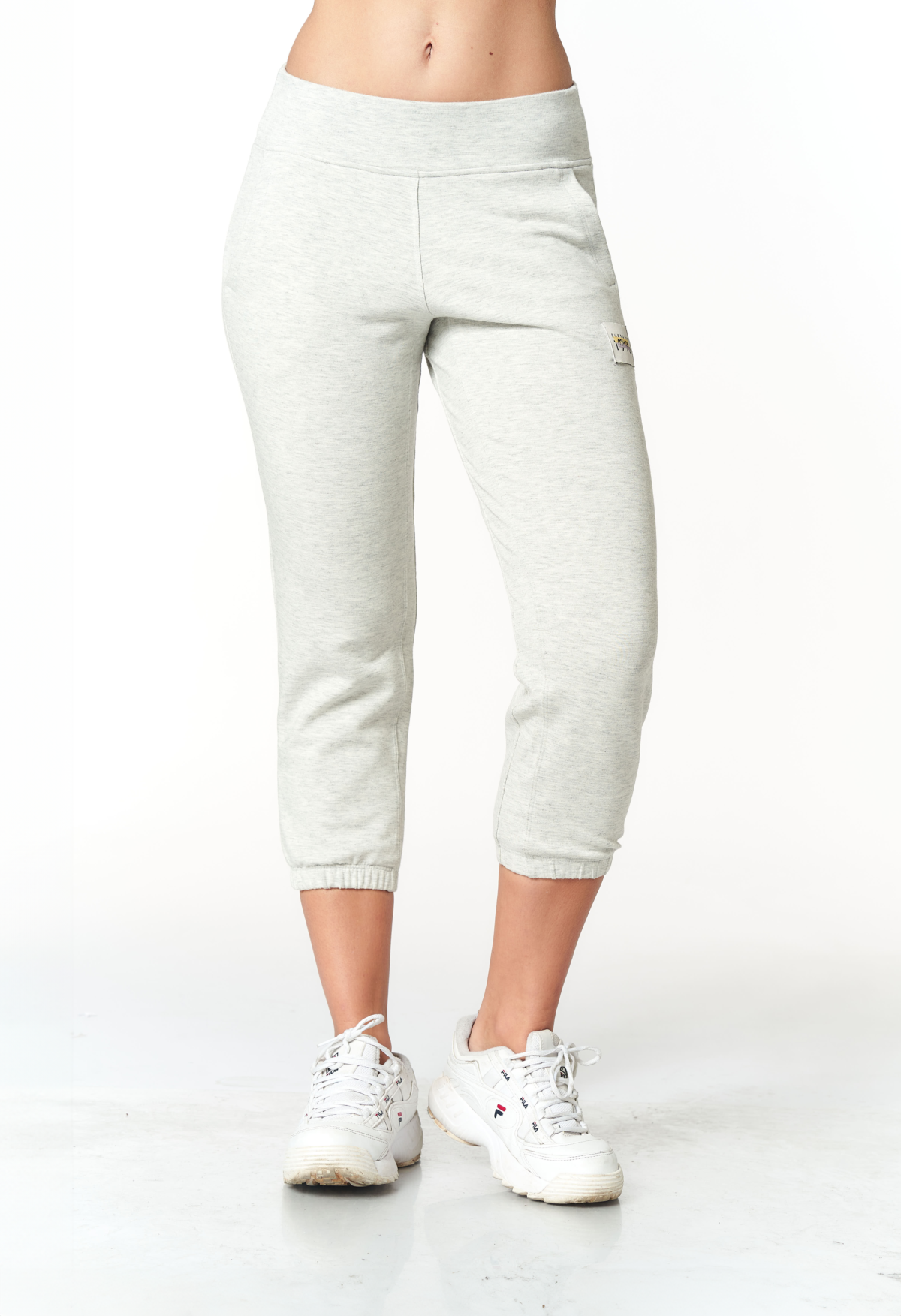 Capri con bolsillos laterales, ajuste en los tobillos y una cintura anatómica. Confeccionado con tejido elástizado ligero y suave, con el confort necesario para todo el dia. Detalle de aplicación.