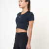 Remera corte regular con manga corta y detalles de elástico en hombros y espalda, realizado en textil ultra soft con spandex que se adapta al cuerpo para ofrecer un libre movimiento y