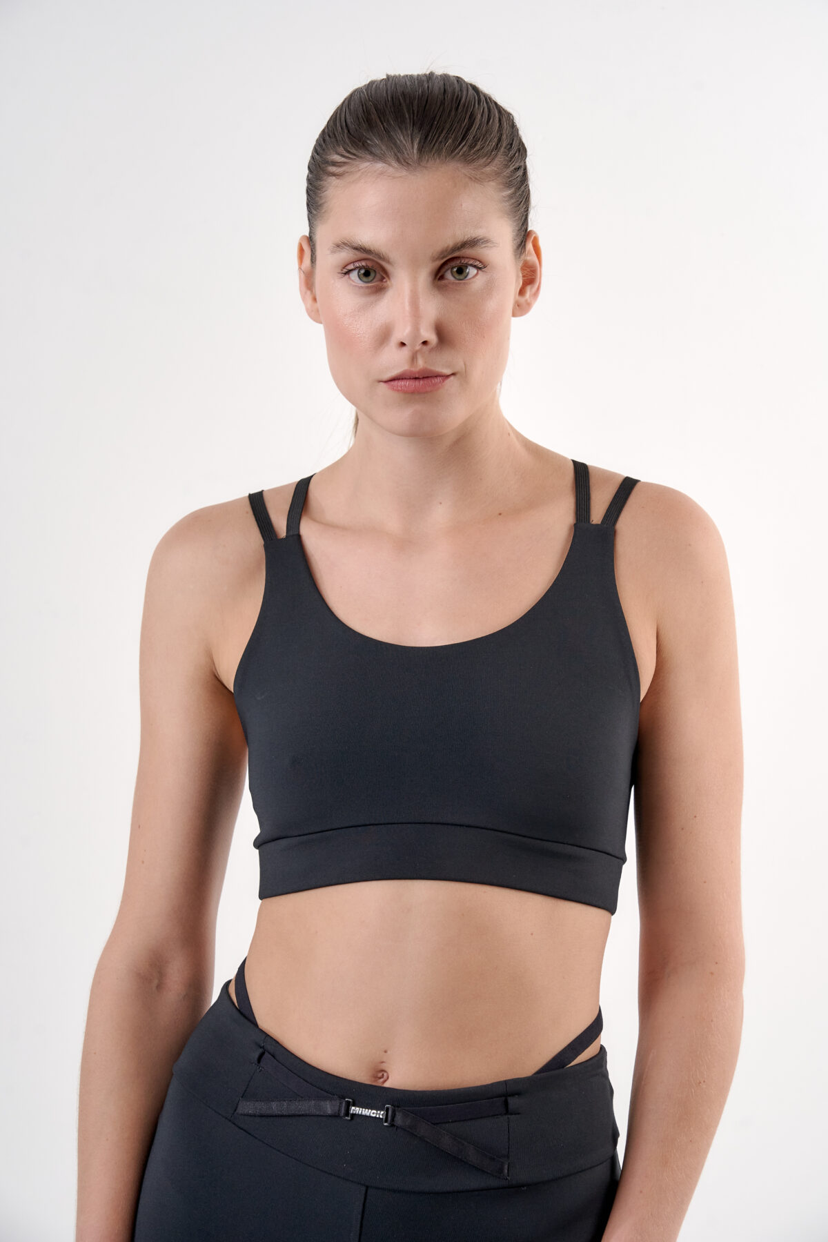 Top deporitvo, hecho con tejido confortable y modelador para tu cuerpo, con detalle de elásticos corseteros cruzados y pasador metálico MWK en espalda completamente descubierta, diseñado para el deporte de mediano y bajo impacto, ofrece seguridad y te permite el libre movimiento.