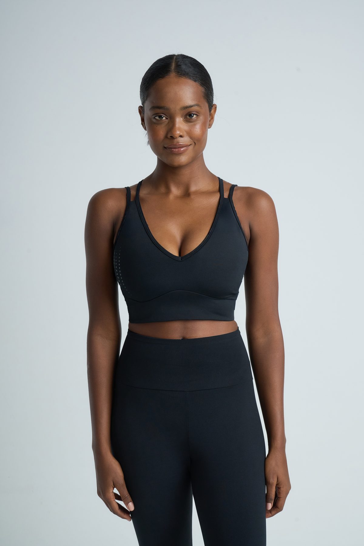 Top 2 en 1, reversible con forreria sublimada. Confeccionado en textil Microfibra ultra opaca con detalle de estampa localizada. Con escote en V y entalle perfecto, diseñado para resaltar la figura, posee cintura con forma y bordador para aplanar costuras. Brinda sujeción alta para el deporte de medio y alto impacto.