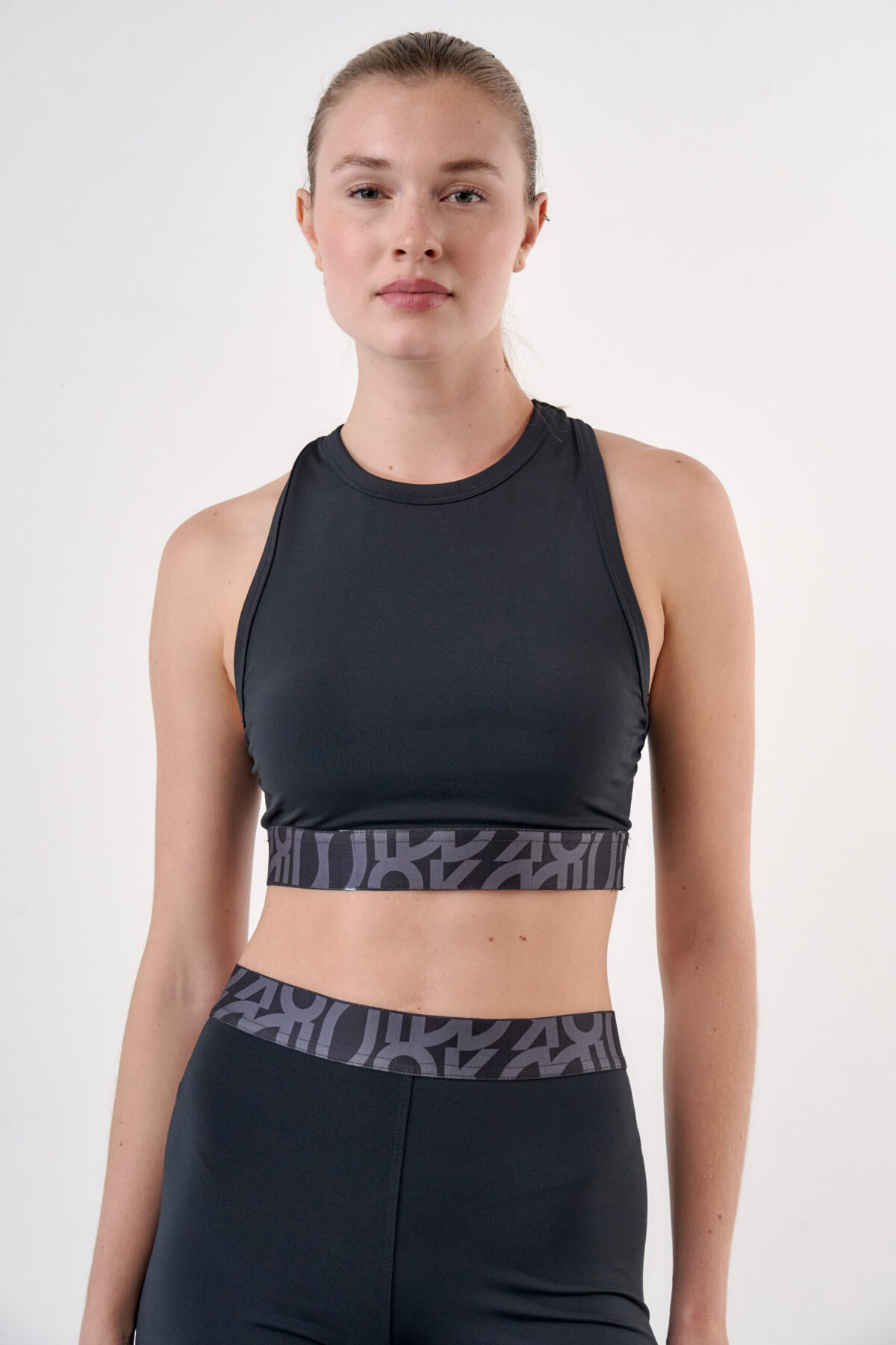 Top deportivo de escote alto, hombro descubierto y espalda con transparencia. Textil compresor Strech 360*, se adapta a diferentes cuerpos y permite mantener el cuerpo seco y un rango de movimiento natural. Detalle de elástico exclusivo de Miwok que con tejidos ligeros y suaves que ofrecen el confort necesario para actividades de mediano a alto impacto.
