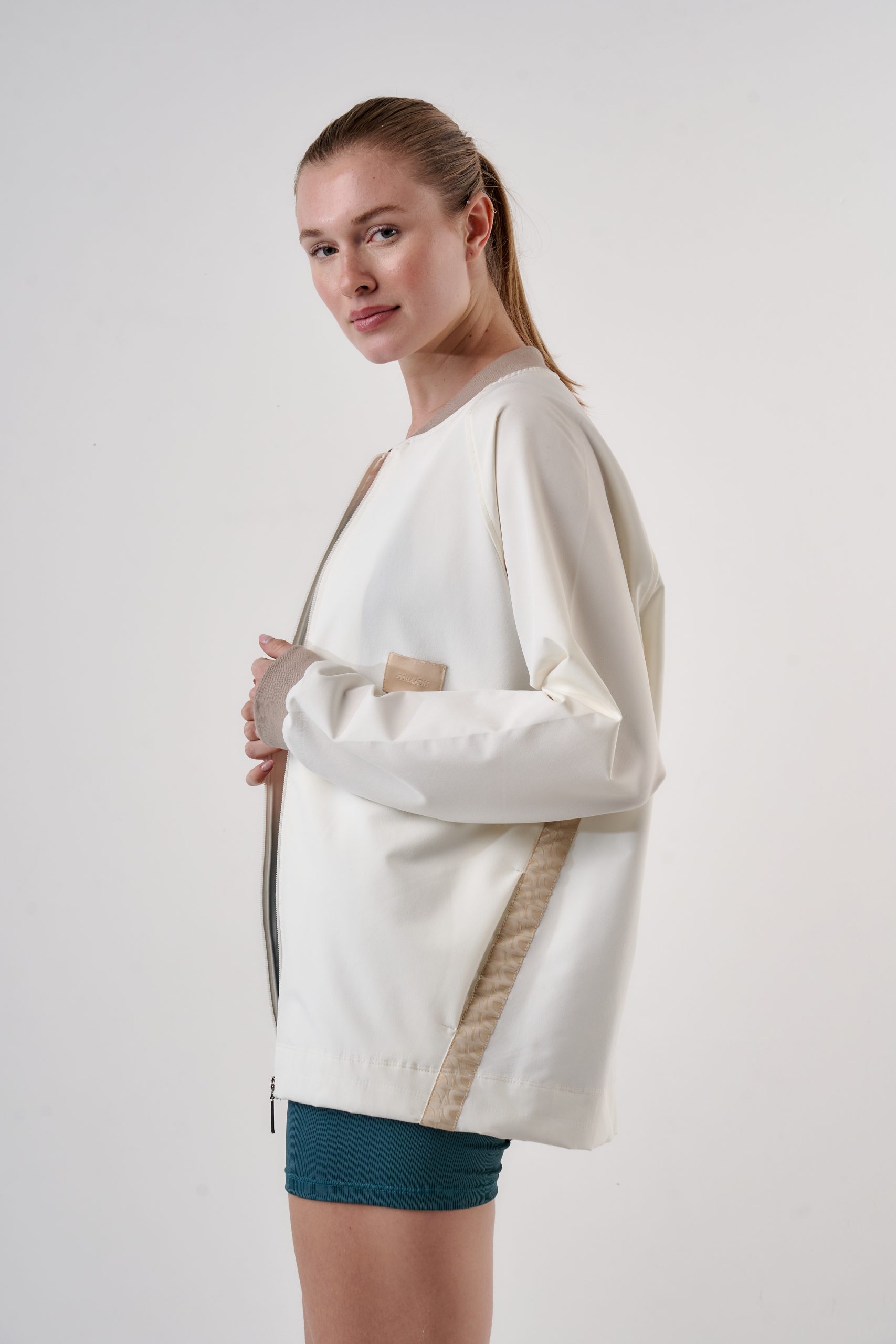 Campera de silueta relajada, confeccionada en tela plana liviana y suave que aporta confort y frescura.